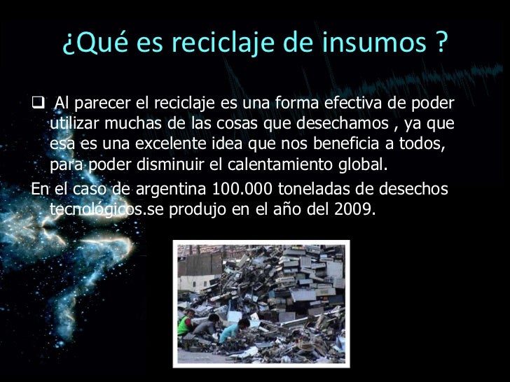 - 2. ¿Qué es reciclaje de insumos ? Al parecer el reciclaje es una forma efectiva de poder utilizar muchas de las cosas que desechamos , ya que esa es una excelente idea que nos beneficia a todos, para poder disminuir el calentamiento global.En el caso de argentina 100.000 toneladas de desechos tecnológicos.se produjo en el año del 2009.